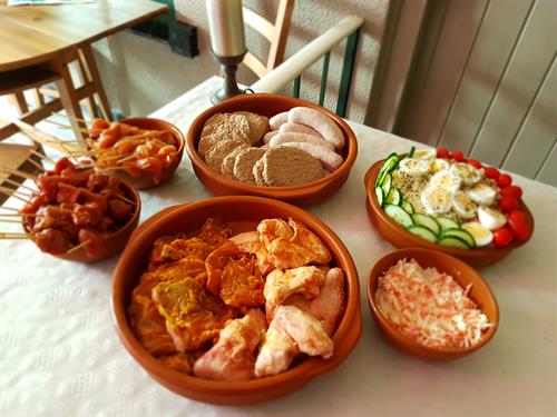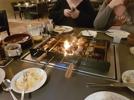 Per persoon tien geselecteerde stukjes vlees, drie salades, vier sausen, stokbrood en kruidenboter.